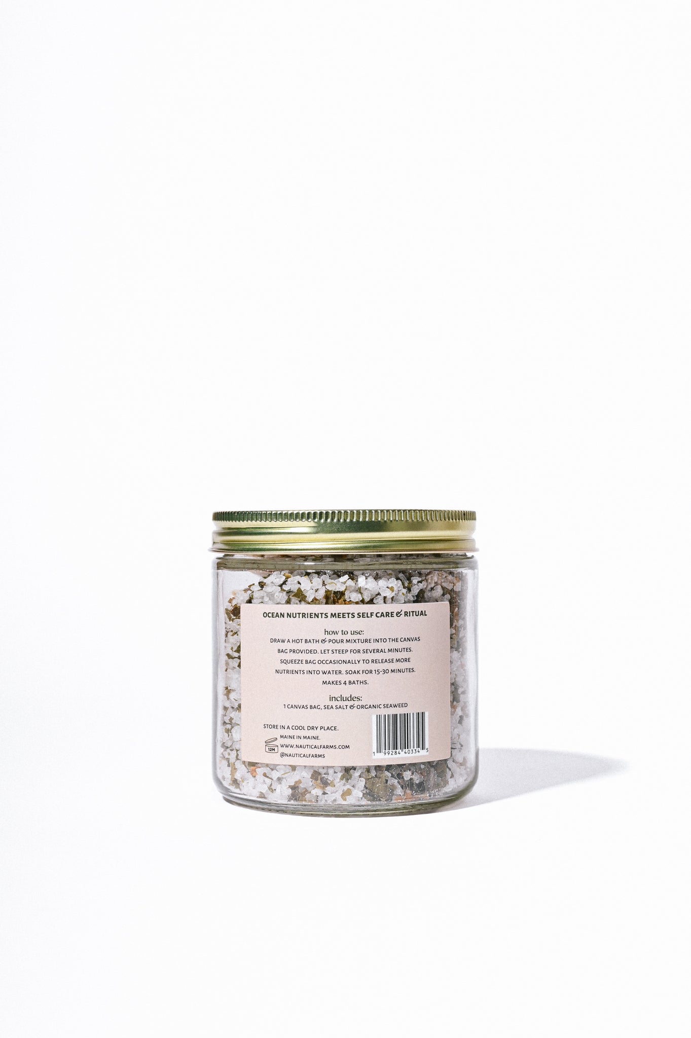 Each 12 oz jar includes a reusable cotton canvas bath bag, making it simple to steep the sea botanicals without the mess—like brewing a warm, mineral-rich tea for your whole body.